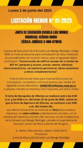 La Junta de Educación de la Escuela Luis Monge Madrigal. Lo invita al concurso para contratación de obra, mediante un procedimiento de licitación menor, para…